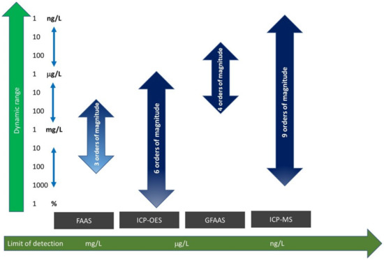 A comparison of the different techniques employed for the analysis of SP samples is presented in Figure 6. The criteria established in this figure are the limits of detection (x-axis) and dynamic linear range (y-axis) that correspond to the concentration range for which there is a linear relationship between the analytical signal and the analyte concentration. According to this figure, it emerged that ICP-MS followed by ICP-OES are the best techniques for trace analysis. First, the limits of detection provided by ICP-MS are the lowest (Table 5) among the techniques considered and, second, the dynamic range is wider for both ICP methods than for AAS ones. The latter point is highly relevant, because it implies that ICP-OES and ICP-MS allow for the analysis of samples with very low as well as high analytical concentrations without the need for a previous sample dilution, thus enormously simplifying the analysis method. It should also be mentioned that unlike in AAS, they are able to determine around 40–50 different elements in the same analytical run. Despite their higher cost and the fact that they also suffer from interferences, ICP techniques have a wide acceptance for use in the multi-elemental analysis of clinical samples.