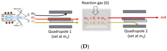 (A) Schematic of an ICP-MS/MS device and (B) strategies followed to overcome spectral interferences (m1, red, analyte; m1, yellowish, interferent). (C) On-mass approach and (D) mass-shift approach. (Adapted from [80]).