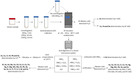 It is important to avoid the contamination of the samples, so to prevent this the glassware [32] or the polyethylene tubes [49] can be immersed in nitric acid. Then, the instrumental was passed through water, distilled water, deionized water, distilled, and redistilled deionized water before use. For seminal plasma preparation and AAS determination, firstly seminal plasma was separated by centrifuging the semen at 300× g for 7 min [48], 1500× g [27] or 600× g for 10 min [49], 612.3× g for 30 min [29], and was even recentrifuged at 100,000× g for two hours [49]. A step of deproteinization by adding tricarboxylic acid before centrifugation also took place in one study [56]. Then, the seminal plasma may be transferred to a clean, dry plain container and stored at −20 [57], −40 [58], or −80 °C [59] until its analysis. Zn, for instance, could be measured directly by flame AAS [60] after sample dilution with deionized water [61]. Other elements, such as Cu, Fe, and Se were measured after dilution by GFAAS [61].