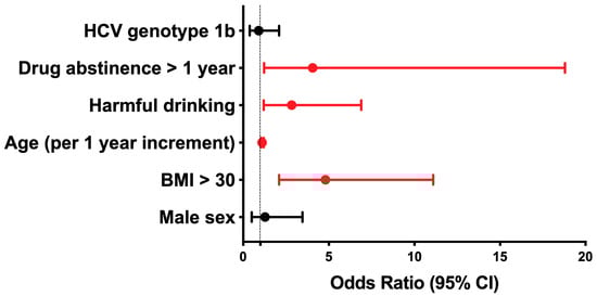 On the other hand, obesity (OR 4.77, 95% CI 2.1–11.1, p < 0.001), abstinence from illicit drugs for more than one year (OR 4.06, 95% CI 1.22–18.79, p < 0.03), harmful drinking (OR 2.83, 95% CI 1.17–6.89, p < 0.03), and older age (OR 1.17, 95% CI 1.05–1.17, p < 0.001) turned out to be significant predictors of an advanced stage of liver fibrosis at the time of treatment initiation (Figure 1).