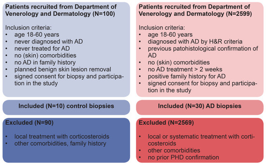 This retrospective case–control study (level of evidence 2B) [38] included 30 patients aged 28–45 (mean age 32 years) (Table 1) who were diagnosed with AD using the clinical diagnostic criteria [8]. The patients had a diagnostic lesional skin biopsy performed earlier that confirmed the diagnosis and were not treated for at least two weeks prior to the study to eliminate any potential effect of corticosteroids or other immunosuppressive drugs. The specimens were archived at the Referral Centre for Contact Dermatitis, Department of Dermatology and Venereology, University Hospital Centre Zagreb. Skin biopsy specimens (punch biopsy technique provided full-thickness 4 mm skin specimens) were also obtained from the same site [39] from 10 healthy age-matched donors (Table 1) who had a regular appointment for benign skin lesion excision and were used as the control group. Informed consent for performing the biopsy, participating in this research, and data publication for this study was obtained from all included patients. Exclusion criteria for patients suffering from AD and controls are shown in Figure 1. All patient-related data were fully anonymized in the analysis within the study. The study protocol followed the EU guidelines and was approved by the ethical committee of the School of Medicine, University of Zagreb.
