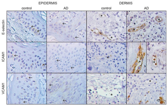 This study showed a detailed spatial arrangement of E-selectin, ICAM-1, and VCAM-1 expression and the difference in the molecular scatter in healthy and AD-affected skin. We found E-selectin to have a moderate expression in basal and suprabasal epidermal layers of controls and weak expression in the case of patients with AD. In the dermis, AD-affected skin showed an intense E-selectin signal in the vascular endothelium and macrophages with a weak signal in the endothelium of controls. ICAM-1 was weakly expressed in the basal and suprabasal epidermal layers of healthy and AD-affected skin. The vascular endothelium in the dermis showed a strong signal for ICAM-1 in patients with AD and a weak one in controls. VCAM-1 expression was found in all epidermal layers of controls but not the dermis. In patients with AD, VCAM-1 expression was scarce in the epidermal basal and suprabasal layers, strong in dermal macrophages, and non-existent in the vascular endothelium.