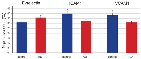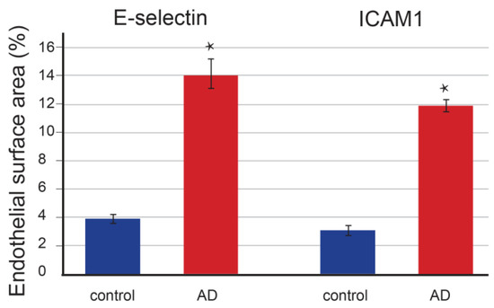 Adhesion molecules, such as intercellular adhesion molecule–1 (ICAM-1), ICAM-3, E-selectin, and L-selectin, are highly expressed in lesions of patients with AD and play an essential role in the AD etiopathogenesis [23,24,25,26,27,28]. Intercellular adhesion molecule-1 (ICAM-1, CD54) is a 90 kDa member of the immunoglobulin (Ig) superfamily. It is critical for the transmigration of leukocytes from blood vessels to tissues, and is constitutively present on endothelial cells and increases in expression in response to pro-inflammatory cytokines. ICAM-1 acts as a leukocyte adhesion molecule and contributes to inflammatory responses by increasing endothelial cell activation [29]. Vascular cell adhesion molecule-1 (VCAM-1, CD 56), an adhesion molecule with Ig domains mainly expressed in endothelial cells, is strongly induced by inflammatory cytokines and plays a critical role in mediating leukocyte adhesion on endothelial cells, and activation of signaling pathways to facilitate leukocyte passage from blood to tissue. [30]. E-selectin (CD62E, endothelial–leukocyte adhesion molecule 1, leukocyte–endothelial cell adhesion molecule 2) is mainly expressed after inflammatory stimulation by activated endothelial cells, and is also expressed in bone marrow and skin. E-selectin binds to ligands expressed in polymorphonuclear and mononuclear leukocytes during inflammation [31].