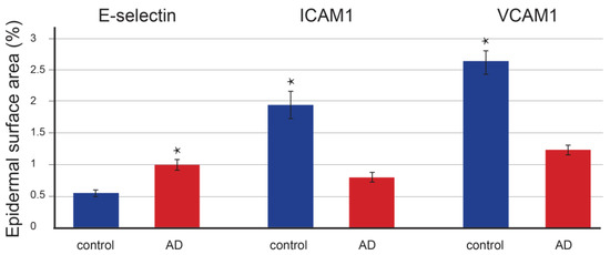 Positive ICAM-1, VCAM-1, and E-selectin epidermal surface area in control and AD-affected skin, as well as endothelial surface areas in the dermal blood vessel wall, were measured using the method of digital image analysis described previously [41]. The data were expressed as the percentage of E-selectin-, ICAM-1-, and VCAM-1-positive epidermal/endothelial surface area, respectively, in the whole analyzed epidermal or endothelial surface area in a microscopical field, depending on where the measurement was performed.