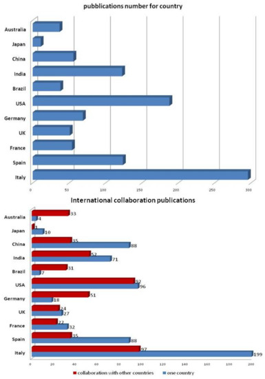 A total of 1523 documents were retrieved. After removing duplicates and papers failing to fulfill the inclusion criteria, the study sample was composed of 816 publications from 57 different countries. Figure 1 reports indexed COVID-19 papers by country: Italy was the most productive country with 296 publications. The United States of America ranked second (n = 188), followed by Spain and India (n = 124 and 123, respectively), Germany (n = 69), China (n = 56), France (n = 54), the United Kingdom (n = 51), Brazil (n = 38), Australia (n = 37), and Japan (n = 11). All other countries accounted for only one or two publications. The total number of papers reported in Figure 1a is higher than 816 because of the presence of collaborative research from authors of different nationalities. In fact, authors from different countries showed a distinct trend toward collaborating with peers for publications (Figure 1b), For example authors from China (39%) and authors from Italy (48%) did report at least one collaborative paper with authors from other countries. The first paper indexed on PubMed concerning COVID-19 and dermatology was published in China in February 2020. Figure 2a shows the distribution of COVID-19 papers by time, and Figure 2b combines publication times and countries. The overall trend shows a progressive increase in the number of publications until a peak was reached between June and July. Publication numbers decrease in August and September, and then stabilize at a plateau (about 60 per month) until December. Analysis of the temporal trends of publications in single nations shows very different trends. In Italy, there was first a higher peak at the beginning of summer, and then a second, lower peak in autumn. The same trend was observed in publications from other European countries. United States-based publications showed a first, lower peak in summer, followed by a second, more abundant number of publications in autumn, and a third rise in the number of publications in winter. A similar trend, with three distinct peaks in the number of publications, is also present in Brazil. Figure 3a shows the distribution based on article type: more than one third of the publications were opinions (34%), 28% were case report or case series, and 20% were research articles. The remaining categories consisted of meta-analyses (11%), guidelines/recommendations (5%), and reviews (2%). Figure 3b shows the time course and type of publication: opinion articles and guidelines/recommendations showed a peak in the first half of the pandemic, significantly decreasing in the second, while research articles increased progressively throughout the study period. The publications appeared in 125 different scientific journals, but only 47 were in the dermatology category. Seventy-six percent (n = 623) of articles were published in 12 dermatological journals. Seventy-five journals (60%) published only one article. The journals that published the largest number of articles were: Dermatologic Therapy (IF 2.327; n ° = 210/25.7%), the Journal of the European Academy of Dermatology and Venereology (IF 5.248; n ° = 128/15.7%), the Journal of the American Academy of Dermatology (IF 8.277; n ° = 56/6.9%), the International Journal of Dermatology (IF 2.067; n ° = 50/6.1%), Clinical and Experimental Dermatology (IF 1.977; n ° = 44/5.4%), the British Journal of Dermatology (IF 7.0; n ° = 36/4.4%), and the Journal of Dermatological Treatment (IF 2.185 n ° = 33/4%).