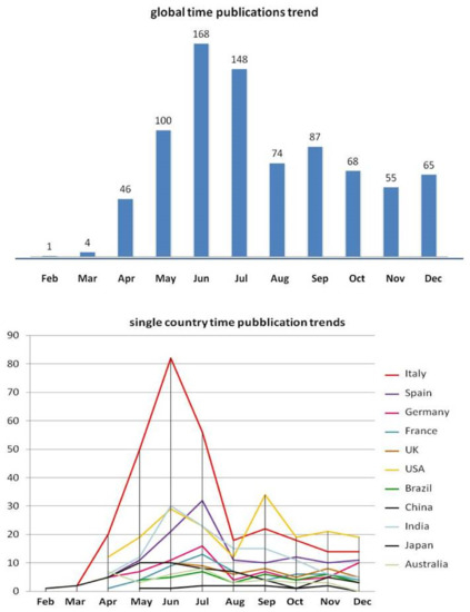 (Upper) Distribution of COVID-19 papers by time. (Lower) Distribution of COVID-19 papers by time and different countries.