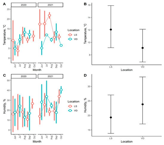 The figures illustrate the descriptive characteristics of two climate variables, temperature (A) and soil humidity (C). Each dot on the figures represents the values of these variables for each month of observation, while the error bars indicate the standard deviation range. The colour scheme used in the figures (A,C) differentiates the locations from which the data were collected. The figures (B,D) show the effect size of the location factor on temperature and humidity, respectively. The dots represent an estimated average effect of the location factor on the dependent variable of GLMMs, while the error bars indicate the 95% confidence intervals of the parameters.