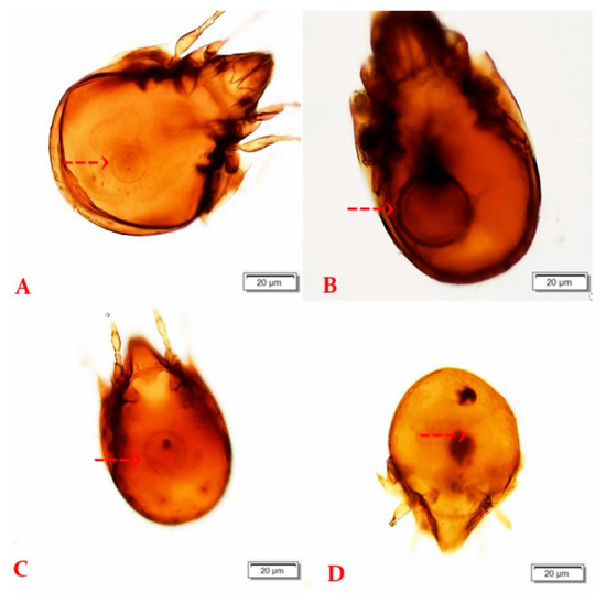 Oribatids with cysticercoid in body cavity ((A) Edwardzetes edwardsi, (B) Trichoribates novus, (C) Ceratozetes gracilis, (D) Scheloribates laevigatus). The arrow indicates cysticercoid (scale 20 µm).