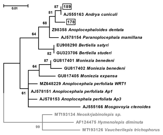 Maximum likelihood phylogenetic tree of Anoplocephalidae based on 18S rRNA gene sequences. The two sequences obtained in this study are boxed. The tree is rooted using Hymenolepididae as an outgroup (shown in grey). The numbers at branches show ultrafast bootstrap supports (values below 50 are omitted). The scale bar denotes the number of substitutions per site.