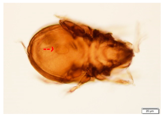 Tectocepheus velatus sarekensis with cysticercoid in the body of cavity after DNA isolation and morphological determination. The arrow indicates cysticercoid.
