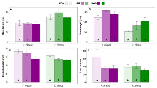 Growth parameters: root length (A), stem length (B), stem diameter (C) and leaf number (D) in Tropaeolum majus and T. minus plants grown under controlled conditions in the greenhouse, after 30 days of water stress treatment (CON—control, IWS—intermediate water stress, SWS—severe water stress). Values shown are means ± SE (n = 6). The same lowercase and uppercase letters indicate homogeneous groups between treatments for T. majus and for T. minus, respectively, according to the Tukey test (p ≤ 0.05).