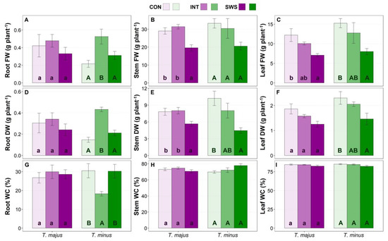 Weight and water content parameters: fresh weight (FW) of roots (A), stems (B), and leaves (C); dry weight (DW) of roots (D), stems (E) and leaves (F); water content (WC) of roots (G), stems (H) and leaves (I) in Tropaeolum majus and T. minus plants grown under controlled conditions in the greenhouse, after 30 days of water stress treatment (CON—control, IWS—intermediate water stress, SWS—severe water stress). Values shown are means ± SE (n = 6). The same lowercase and uppercase letters indicate homogeneous groups between treatments for T. majus and for T. minus, respectively, according to the Tukey test (p ≤ 0.05).