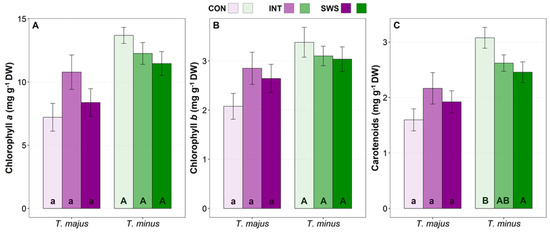 Effect of 30 days of water stress treatment (CON—control, IWS—intermediate water stress, SWS—severe water stress) on the contents of photosynthetic pigments in T. majus and T. minus leaves. Chlorophyll a (A), Chlorophyll b (B), and total carotenoids (C). Values shown are means ± SE (n = 6). The same lowercase and uppercase letters indicate homogeneous groups between treatments for T. majus and for T. minus, respectively, according to the Tukey test (p ≤ 0.05).