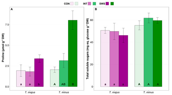 Effect of 30 days of water stress treatment (CON—control, IWS—intermediate water stress, SWS—severe water stress) on leaf concentrations of Proline (Pro) (A) and total soluble sugars (TSS) (B) in T. majus and T. minus plants. Values shown are means ± SE (n = 6). The same lowercase and uppercase letters indicate homogeneous groups between treatments for T. majus and for T. minus, respectively, according to the Tukey test (p ≤ 0.05).