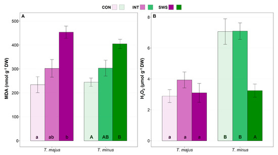Effect of 30 days of water stress treatment (CON—control, IWS—intermediate water stress, SWS—severe water stress) on leaf concentrations of oxidative stress markers in T. majus and T. minus plants. Malondialdehyde (MDA) (A) and hydrogen peroxide (H2O2) (B). Values shown are means ± SE (n = 6). The same lowercase and uppercase letters indicate homogeneous groups between treatments for T. majus and for T. minus, respectively, according to the Tukey test (p ≤ 0.05).