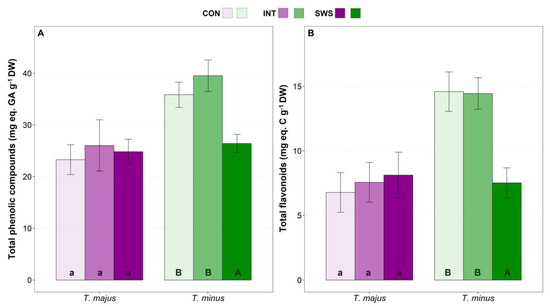Effect of 30 days of water stress treatment (CON—control, IWS—intermediate water stress, SWS—severe water stress) on leaf concentrations of total phenolic compounds (TPC) (A) and total flavonoids (TF) (B) in T. majus and T. minus plants. Values shown are means ± SE (n = 6). The same lowercase and uppercase letters indicate homogeneous groups between treatments for T. majus and for T. minus, respectively, according to the Tukey test (p ≤ 0.05).