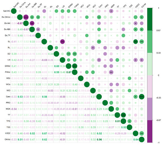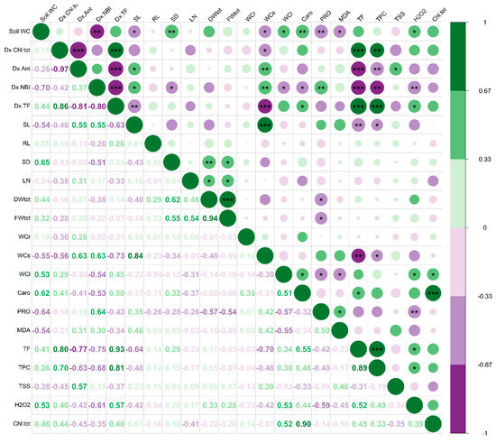 Matrix of the Pearson correlation coefficients between the 22 traits measured on T. majus. The strength of each correlation is represented by a circle above the diagonal, with larger and more intense circles indicating stronger correlations. Green circles indicate a positive correlation (from 0 to 1), whereas violet circles indicate a negative correlation (from 0 to −1). Significance levels are denoted by asterisks (*, **, and ***, at p < 0.05, 0.01, and 0.001, respectively). The numerical values of the correlation coefficients are displayed below the diagonal. Abbreviations: soil water content (soil WC), Dualex total chlorophyll (Dx Chl tot), Dualex anthocyanins (Dx Ant), Dualex nitrogen balance index (NBI), Dualex flavonols (Dx TF), stem length (SL), root length (RL), stem diameter (SD), leaf number (LN), total dry weight (DWtot), total fresh weight (FWtot), root water content (WCr), stem water content (WCs), leaf water content (WCl), carotenoids (Caro), proline (PRO), malondialdehyde (MDA), total phenolic compounds (TPC), total flavonoids (TF), total soluble sugars (TSS), hydrogen peroxide (H2O2), total chlorophyll (Chl tot).