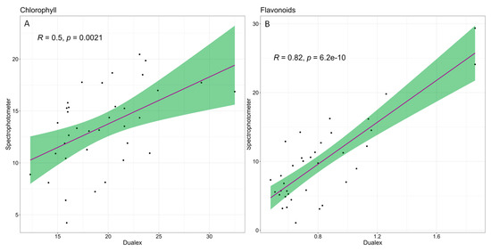 Scatterplot between (A) the content of chlorophyll measured with the Dualex sensor and the spectrophotometer and (B) the content of flavonoids measured with the Dualex sensor and the spectrophotometer. The green shaded area around each line represents a 95% confidence interval for the relationship between the variables.