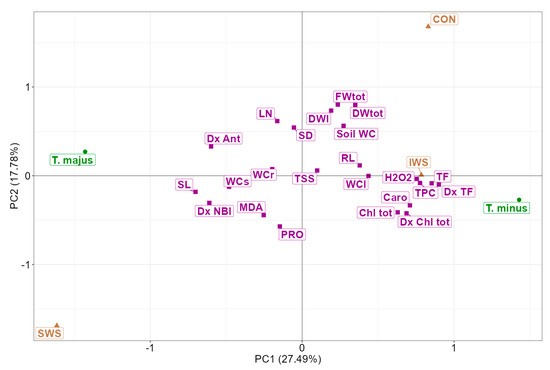 PCA biplot of the 22 measured traits. The brown triangles represent the water treatments: control (CON), intermediate water stress (IWS), and severe water stress (SWS). The green circles indicate the two investigated species (T. minus and T. majus), whereas the violet squares display the 22 measured traits. Abbreviations as in Figure 7.