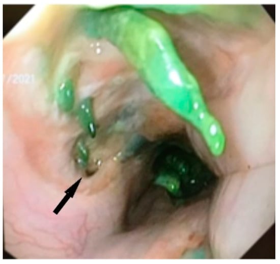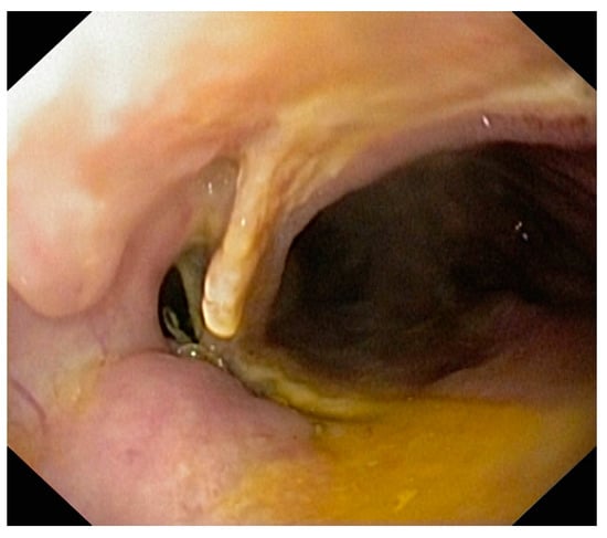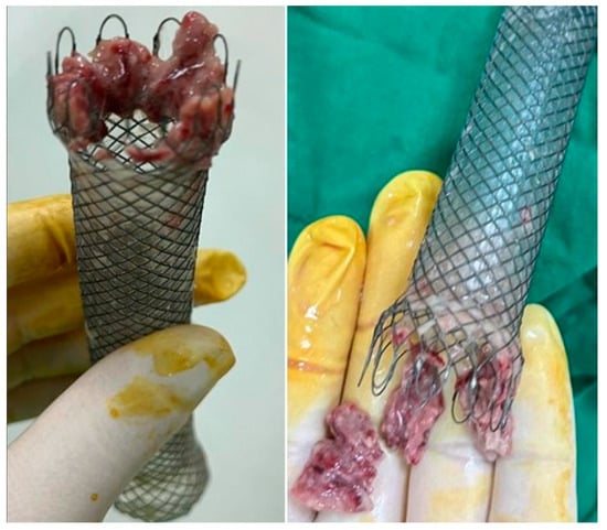 Speer et al. in 2016 reported major erosions with tracheoesophageal fistulas in 2/23 patients [14] and Al-Issa et al. in 2/15 patients [37], and Licht et al. described stent erosion in the pulmonary artery occurring in 1/31 patients [48], all requiring major reinterventions. In the literature, according to studies, it has been shown that most aortic fistulas appear after prolonged maintenance of the stent, from 26 to 36 days [49]. Haruštiak et al. described the presence of esoaerial fistula in 4/39 (10%) of stented patients [26]. We discovered the esotracheal fistula and proliferation of cartilaginous tissue, probably of tracheal origin in a patient after the extraction of the second stent, placed for a persistent anastomotic fistula 6 weeks after the insertion of the first stent (Figure 5 and Figure 6).