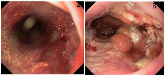 Hemorrhage due to mucosal erosion after 3 weeks (A), visible mucosal lesions after stent extraction; (B) esophagogastric anastomosis after Ivor Lewis procedure.