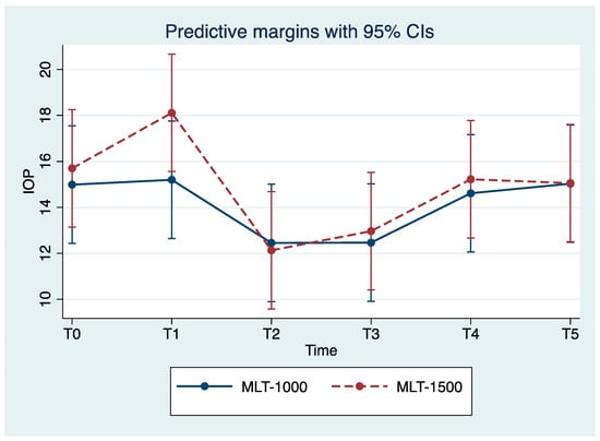 We observed reduced IOP values for all eyes with the maximum reduction in IOP achieved for T2. Over the study period, the MLT 1500 group observed a significant improvement in IOP, with mean reduction values of 22.9% and 17.8% for T2 and T3 compared to the baseline values (p = 0.004, p = 0.024), respectively. Less pronounced improvements in IOP were observed among the MLT 1000 group, with a mean reduction of 17.3% for both T2 and T3, compared to the baseline values (p = 0.044, p = 0.012), respectively; observe Table 2 and Figure 1. For T4, IOP mean values returned close to those registered prior to the treatment and were stable for T5.
