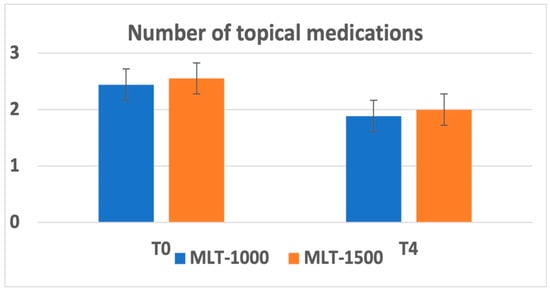 Number of topical medications at baseline (T0) and at 3 months after MLT intervention (T4).