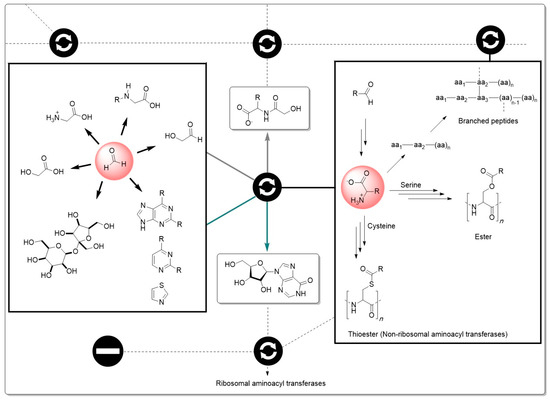 Even a very simple starting material, such as formaldehyde [9], may lead to an entire library of derivatives, including hydroxy acetic acid, glycine, N-substituted glycines, and hydroxyacetaldehyde, hence providing lots of sugars [10] and various nitrogen heterocycles. The reaction of any given aldehyde with ammonia and cyanide anion would give an aminonitrile, which would be hydrolysed to an aminoamide and then to an amino acid [11,12]. Amino acids would condense, delivering messy mixtures of peptides, including not only linear ones but also branched peptides thanks to diamino acids (e.g., lysine). However, such polymerization would be counterbalanced by amide bond hydrolysis, so there would always be monomers and short chains, and the most stable sequences would be favored in long chains. Esters would be formed from serine residues, adding ester functions to the polyamide main chains, and thioesters may also be formed from cysteine residues (compared to non-ribosomal aminoacyl transferases nowadays) [13]. In addition, nothing precludes monomeric amino acids from reacting with other types of monomers. They may react with sugars at the anomeric position or at other positions (as they do currently at the 3′ and 2′ positions of the terminal adenosine of t-RNAs).They may also react with many other acids to give diverse amides (different from peptides), just as aspartic acid takes part in the de novo synthesis of inosine, for instance [14]. Many heterocycles would also be present [15,16]. Thus, starting from a great multiplicity of components, an incredibly messy mixture of molecules would have formed—most of which were not relevant at all to the development of life.