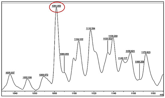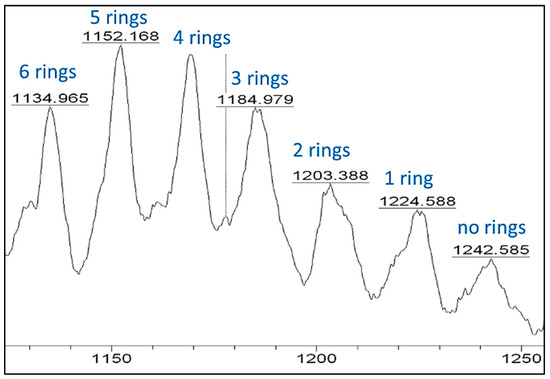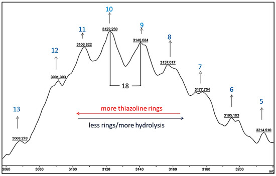 Taking as an example the region of masses shown in Figure 12, we can observe seven single masses, which correspond to seven Cys-Ala units that end with a nitrile. The highest number of possible thiazoline rings in the case of (Cys-Ala)7-CN is six rings, and this is reflected in the calculated mass of 1134.4598 (observed 1134.965). The adjacent peak, 1152.168, contains one hydrolyzed thiazoline ring, and five rings are still present.