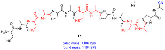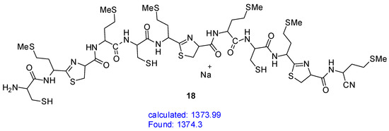 As an example, the peptide structure 18, which consists of six Cys-Met units, contains three thiazoline rings, and ends with a nitrile, is presented in Figure 6.