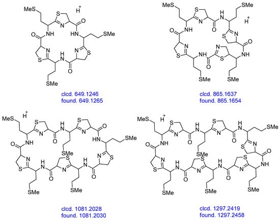 Masses presented in Table 2 are average masses. To confirm the proposed structures, we also performed high-resolution mass spectrometry (HRMS-SEI). As shown in Figure 9, the found exact masses agree with the proposed thiazoline-containing cyclopeptides cyclo(CysMet)n for n between 3 and 6. Unfortunately, the quantities of cyclo(CysMet)7 and cyclo(CysMet)8 in the mixture of polymers were not sufficient to allow the measurement of their exact masses.