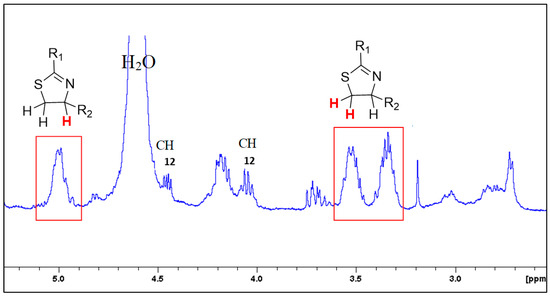 As shown in Figure 10, thiazoline rings were characterized by 1H-NMR spectroscopy thanks to the appearance of new signals around 5 ppm (CH of thiazolines) and in the region from 3.3 to 3.6 ppm (CH2 of thiazolines).