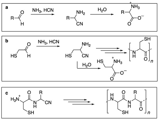 Looking into proteins, cysteine residues with their thiol functional group shows a remarkable tendency for their presence in catalytic sites [17]. The presence of thiol groups allows protein folding and redox reactions via the formation of disulfide bonds. As they are part of iron–sulfur clusters, they are key players in the formation of metalloproteins, such as ferredoxins (four cysteine residues involved), and in zinc fingers (in which up to six cysteine units are involved), both of which are important in protein–protein and DNA (or RNA)–protein interactions. In view of the importance of thiols, the hypothesis that cysteine has been integrated into the primitive peptide chains is persuasive [18]. Plausible prebiotic syntheses of cysteine have been described [19,20]. The next question is: how were cysteine residues able to assemble with the other amino acids to form thiol-containing peptides that grow and finally gain a function? It is possible that both the formation and polymerization of amino acid units were related and synchronized while in harmony with the geochemical environment. Hydrogen cyanide may have played a crucial role in such chemistry. HCN is widespread in the cosmos and seen in different areas, such as near carbon stars, proto-planetary nebulae, and comets [21,22]. Therefore, it is likely that HCN existed on the early Earth. This would have given a central role to the Strecker reaction (Scheme 1a) in the synthesis of amino acids, including cysteine (Scheme 1b). From the aminonitrile intermediate of the Strecker reaction, dipeptides containing terminal nitrile function may have been formed, including Cys-AA-CN (where AA stands for any amino acid) [23]. In this paper, we describe our results from the condensation of two representative examples of these aminothiol-containing amidonitriles and demonstrate that they readily polymerize, thereby giving highly complex mixtures of thiol-rich polypeptides (Scheme 1c).