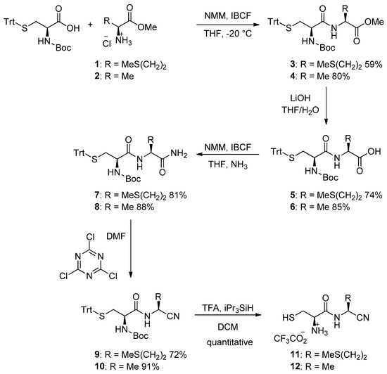 Boc-Cys(Trt)-OH (N-(tert-butoxycarbonyl)-S-trityl-l-cysteine) was activated with IBCF (isobutyl chloroformate) in the presence of NMM (N-methyl morpholine). Then, methyl esters of, respectively, methionine 1 and alanine 2 were added to give the corresponding esters: respectively, 3 and 4. The esters were then transformed into the corresponding acids 5 and 6. These acids were activated with IBCF and NMM, and then gaseous ammonia was added to give the amides 7 and 8. The obtained amides were then transformed to nitriles 9 and 10 using cyanuric chloride in DMF. The last step of the synthesis was the cleavage of Boc and Trt groups to obtain the nitriles 11 and 12. The final salts were recovered in D2O for NMR studies or in H2O for mass analysis.