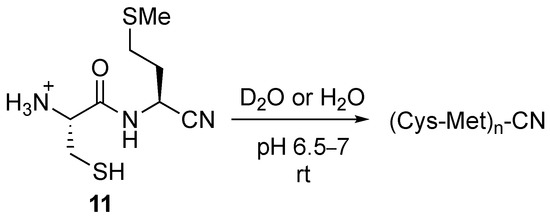 The first test was run in deuterated water (D2O). After the deprotection of compound 9, Cys-Met-CN 11 was extracted as a TFA salt in D2O. The obtained nitrile was found to be stable in acidic water (pH 1–2) for several days. The acidic solution was neutralized using sodium bicarbonate to reach a neutral pH (6.5–7). At this stage, we observed a turbid solution that, within a day, gave a white solid precipitate. This indicates the formation of polymeric materials based on cysteine and methionine amino acids (Scheme 3).