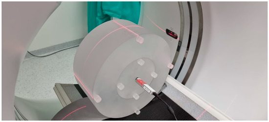 Acrylic phantom used for dosimetry in CT. Here, a 32 cm diameter phantom (torso) with nine holes. A pencil probe sits in the central hole with an ionization chamber. The visible laser lines position the phantom in the gantry.