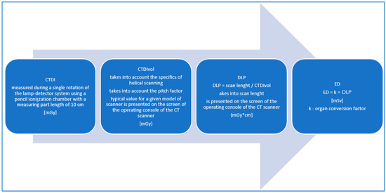 In radiological practice, we encounter the terms CTDIvol, the volumetric computed tomography dose index, and DLP, the dose-length product, which are calculated using the algorithms of the CT machine, presented on the screen of the CT scanner work console and saved in the DICOM format in the radiation dose structured report (RDSR). In 1981, the definitions of the computed tomographic dose index (CTDI) and the multiple scan average dose (MSAD) were introduced. The definition of the CTDI has changed as a new generation of CT technologies have developed. The implementation of multi-slice CT scanners and CT scanners that use wide beams of radiation has affected the CTDI’s ability to determine the radiation dose accurately. Since 2002, device manufacturers have been required to display the tomographic volumetric dose index (CTDIvol) and the dose-length product (DLP) on the operator’s console. The predicted value of the CTDIvol appears on the console after the topogram is executed and before starting the actual study. It can be used to estimate the dose even before the test is performed [1,18,19]