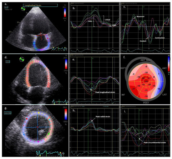 - Badano, L.; Kolias, T.; Muraru, D.; Abraham, T.P.; Aurigemma, G.; Edvardsen, T.; D’Hooge, J.; Donal, E.; Fraser, A.G.; Marwick, T.; et al. Standardization of left atrial, right ventricular, and right atrial deformation imaging using two-dimensional speckle tracking echocardiography: A consensus document of the EACVI/ASE/Ind. Eur. Heart J. Cardiovasc. Imaging 2018, 19, 591–600. [Google Scholar] [CrossRef] [PubMed]