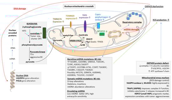 - Alterations in mtDNA abundance. Mitochondria have multiple copies of mtDNA, and this copy number changes in response to energy demands, with both increased and decreased mtDNA content previously reported in cancer cells [94,95]. In the majority of BCs, the mtDNA content was decreased compared to the adjacent histologically normal tissue when measuring the mean mtDNA content using quantitative RT-PCR and ND1 gene primers [61].