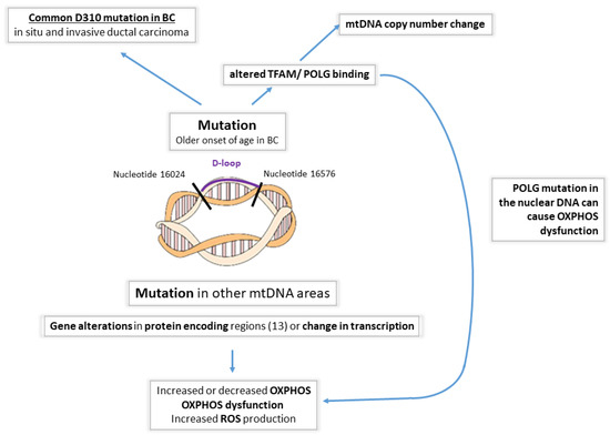- mtDNA displacement loop alterations (Figure 2). The D-loop is considered a hot spot for mutations [79] and is up to ~60 times more susceptible to mutations than the coding regions, according to some studies. The increase in susceptibility, however, is variable among different studies, with some showing only a 7-fold increase [60]. The D-loop itself is a noncoding region, but mutations in this area are typically significant and potentially affect the expression of mtDNA-encoded protein/s or alter mtDNA replication. The replication of mtDNA starts in the displacement loop (D-loop) region located between nucleotides 16024 and 16576. mtDNA replication involves DNA polymerase γ (POLG) and mitochondrial transcription factor A (TFAM), the latter being the key transcription factor regulating mtDNA copy numbers [87,88]. In BC patients, the occurrence of D-loop mutations is associated with an older age of onset [61]. A homopolymeric C-stretch within the D-loop, termed the 310 microsatellite sequence, is a relatively conserved region that includes the replication origin of the mtDNA heavy strand [89]. Previous reports have shown D310 sequence alterations in human cancers, including ductal in situ carcinomas (68%) and invasive ductal carcinomas (71%) [57]. In another small study, 11 of 18 BCs harbored mtDNA mutations, of which 42% were D310 alterations [39]. Histologically normal breast epithelial cells adjacent to invasive ductal carcinomas that carry D310 mutations may already represent tumor cell clonal expansion [57]. However, these may not be representative of a larger cohort.