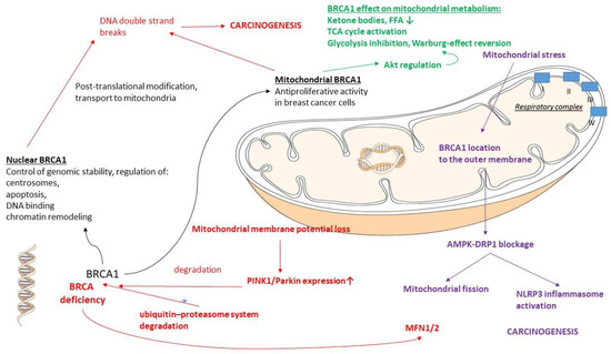 It has been demonstrated that the majority of mitochondrial proteins are nuclear encoded and post-translationally imported in the mitochondria [156]. The nuclear, cytoplasmic, and mitochondrial localization of BRCA1 proteins in human cells was recently evidenced [157], with mitochondrial BRCA1 proteins having an antiproliferative effect on BC cells [158].