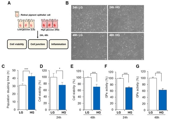 High glucose levels decrease RPE viability and proliferation rate. (A) The effect of high glucose levels on ARPE-19 was analyzed over time. (B) The cellular shape of RPE was monitored for 48 h after low glucose (LG) or high glucose (HG) treatment. Scale bar: 100 μm (C) Proliferation rate was assessed by calculating the mean population doubling time over 24 and 48 h. Cellular viability was determined by MTT assay at 24 (D) and 48 h (E). GPx activity was determined at 24 (F) and 48 h (G). Values represent the mean ± standard deviation of three independent experiments. * p < 0.05, *** p < 0.001.