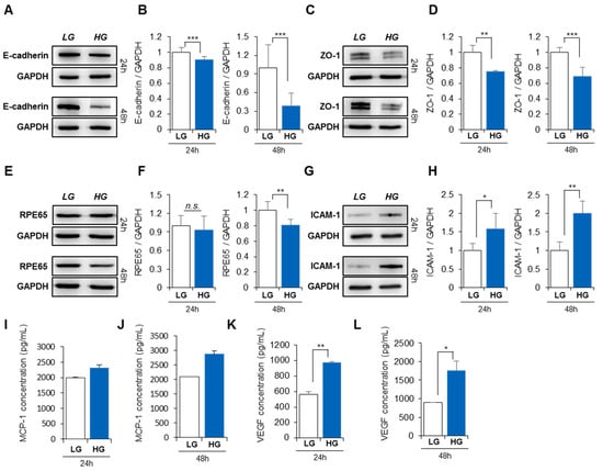 RPE cellular characteristics are altered by high glucose levels. RPE cells were lysed for western blotting, and E-cadherin and ZO-1 expression levels were examined at 24 (A,C) and 48 h (B,D). Protein levels of RPE65 were evaluated at 24 (E) and 48 h (F) after LG or HG treatment. ICAM-1 expression was assessed at 24 (G) and 48 h (H). MCP-1 and VEGF production were analyzed by ELISA at 24 (I,K) and 48 h (J,L). Values represent mean ± standard deviation of three independent experiments. * p < 0.05, ** p < 0.01, *** p < 0.001.