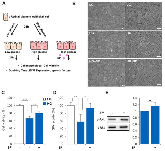 Cell survival-related signaling [45], such as Akt signaling, should be activated to enhance cell viability. Pathological stress, including oxidative stress, is ameliorated by Akt signaling pathway activation [45,46]. A previous study found that SP can enhance cell viability through the Akt signaling pathway under pathological conditions [36]. To examine whether SP-enhanced cellular activity and antioxidant activity are accompanied by Akt signaling or not, phospho-Akt and total Akt expression were analyzed 10 min after SP treatment under HG conditions. As shown in Figure 3E, SP induced Akt phosphorylation, which is anticipated to contribute to the restoration of cell viability in RPE under HG conditions (Figure 3E).