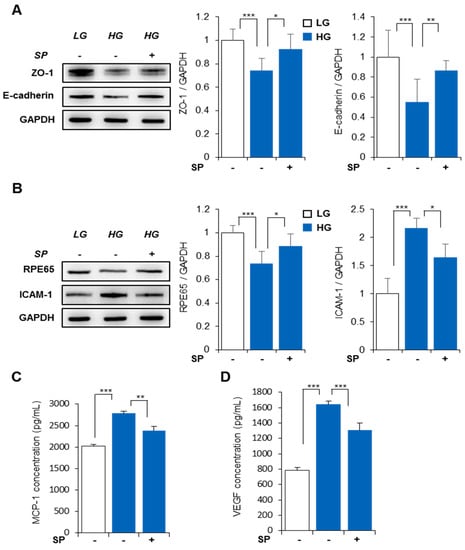 SP ameliorates alteration of high glucose-damaged RPE. SP was added to RPE cells pre-treated with HG for 24 h. Cell lysates were prepared 24 h later for analysis. (A) ZO-1 and E-cadherin expression levels were analyzed by western blotting. (B) RPE65 and ICAM-1 expression were assessed by western blotting. (C,D) MCP-1 and VEGF secretion were evaluated in conditioned media by ELISA. Values represent mean ± standard deviation of three independent experiments. * p < 0.05, ** p < 0.01, *** p < 0.001.