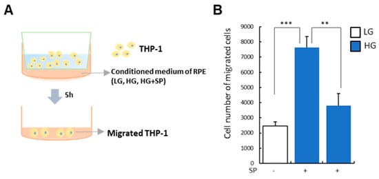 SP treatment suppresses RPE-mediated immune cell migration. RPE was cultured in each condition and its conditioned medium (CM) was added to THP-1 in transwell. 5 h later, migrated cell into the bottom was compared. (A) Diagram of CM treatment (B) Migrated cell from upper to the bottom was counted. Values represent mean ± standard deviation of three independent experiments. ** p < 0.01, *** p < 0.001.