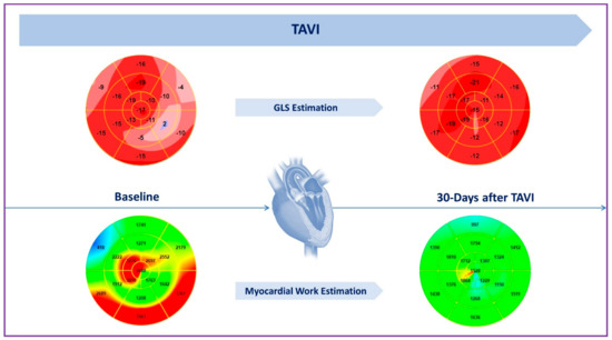 Recently, noninvasive measurement of LV myocardial work (MW) has proven to be a valuable method for estimating myocardial performance in AS patients undergoing TAVI [24]. This tool incorporates echocardiographic strain data, cardiac events timing (from aortic and mitral valve opening and closure), and estimation of LV pressure (derived from systolic blood pressure) in order to derive global work index (GWI), global constructive work (GCW), global wasted work (GWW) and global work efficiency (GWE). In the specific setting of AS patients, LV pressure estimation is obtained by adding the mean aortic transvalvular gradient to the aortic systolic pressure. Jain et al. found that myocardial work indices decreased significantly following TAVI as a direct result of the acute relief of the aortic obstruction and decreased afterload. However, global work indices remained abnormal after the procedure, suggesting an incomplete recovery of the LV function after TAVI [25] (Figure 1). Moreover, lower values of GCW and GWI at baseline in AS patients have been associated with advanced stages of myocardial disease and with a worse prognosis even after aortic valve replacement [24].