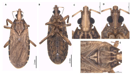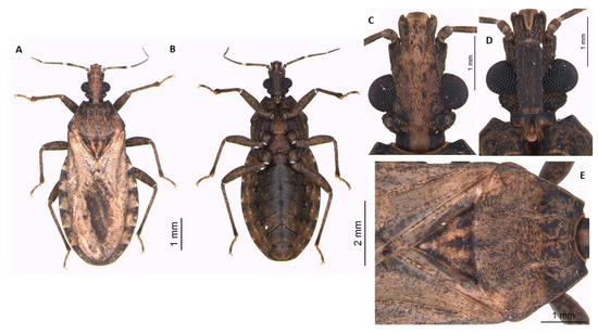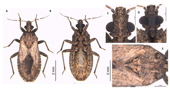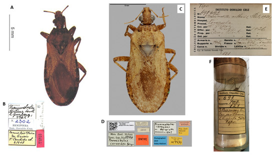 P. tertius (deposited in the Collection of Triatomines of the Oswaldo Cruz Institute, Rio de Janeiro, Brazil) (Figure 1A,B), P. coreodes (deposited in the Zoological Museum, Helsinki, Finland; http://id.luomus.fi/GZ.45902, accessed on 14 October 2022, (Figure 1C,D) and P. arthuri (deposited in the Entomological Collection of the Oswaldo Cruz Institute, Rio de Janeiro, Brazil) (Figure 1E,F) were analyzed.