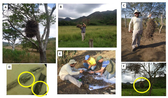 Aspects of the fieldwork. (A) A nest of Phacellodomus sp. in Brazil. (B) Nest collection in Venezuela. (C) Nest collection in Brazil. (D) Eggs adhering to nest sticks. (E) Nest sorting in the field. (F) Phacellodomus sp. in Venezuela.