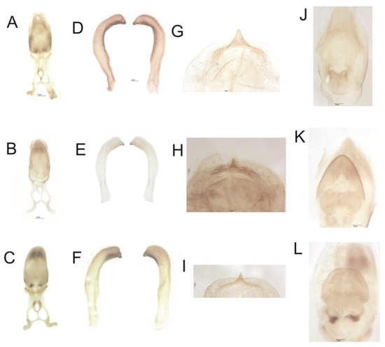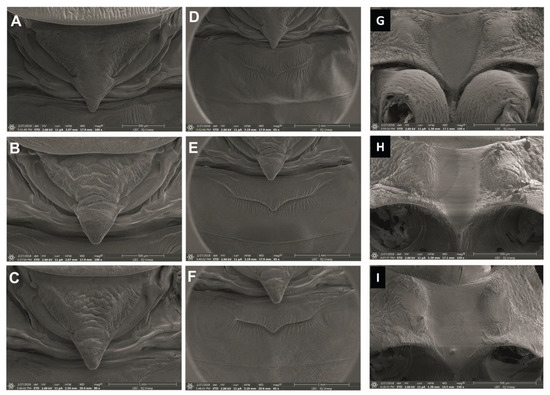 Ventral view: the dividing line of segment VII with gonocoxites 8 is concave and similar in P. arthuri and P. coreodes (Figure 6G,H) and differs in the central part in P. tertius (Figure 6I). Segment IX is irregular and has an undulating shape throughout its length in all three species (Figure 6G–I). The gonocoxite 8 in P. arthuri are rounded (Figure 6G), in P. coreodes they are convex in the lateral and border with gonapophysics 8 and are rounded in all other areas (Figure 6H) and in P. tertius they have a trapezoidal shape, gonapophysis 8 (Figure 6I). Gonapophysics 8 in P. arthuri (Figure 6G) is short and curved, while in P. coreodes and P. tertius they are triangular and similar (Figure 6H,I).
